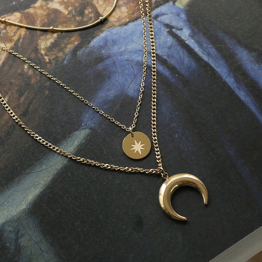 Moon and Stars Charm Pendant Double Chain Necklace 14K Gold Plated Layered Gift Pouch