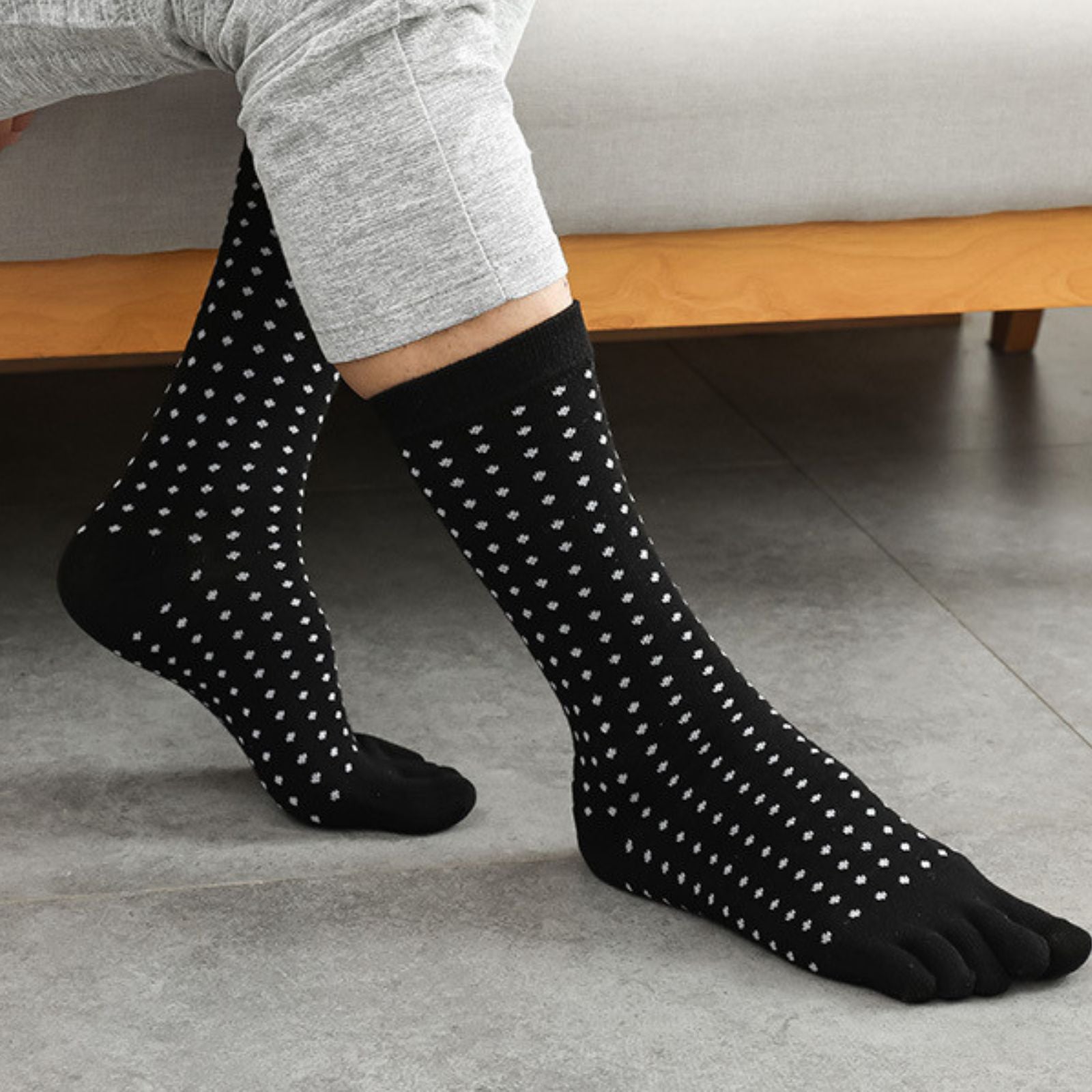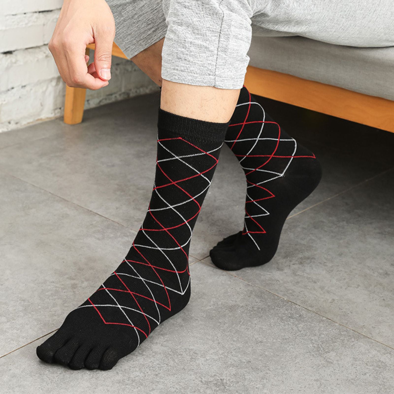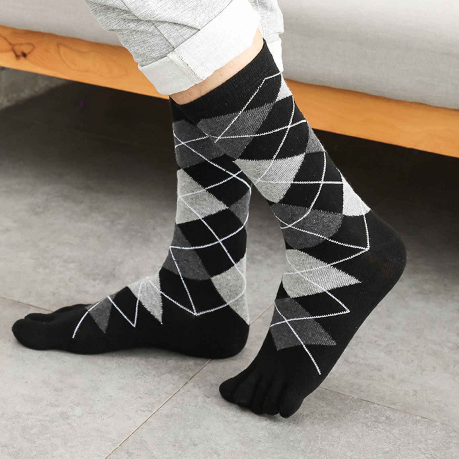 Discover comfort and style with our Men's 4-Pair Gift Box of Cotton Mid-Calf Casual Socks. This set includes uniquely patterned black diamond, argyle, and striped designs, along with an innovative pair of toe socks. Crafted from soft, breathable cotton, these socks offer maximum comfort for everyday wear. The mid-calf length ensures ideal coverage and the distinct patterns add a sophisticated touch to your casual attire. These socks are presented in a chic gift box, making them the perfect present for style-conscious individuals. Elevate your sock drawer with this versatile set!
