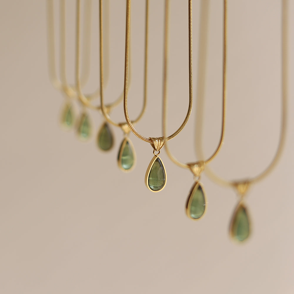 Gold-Plated Teardrop Pendant Necklace with Green Synthetic Cat Eye Stone